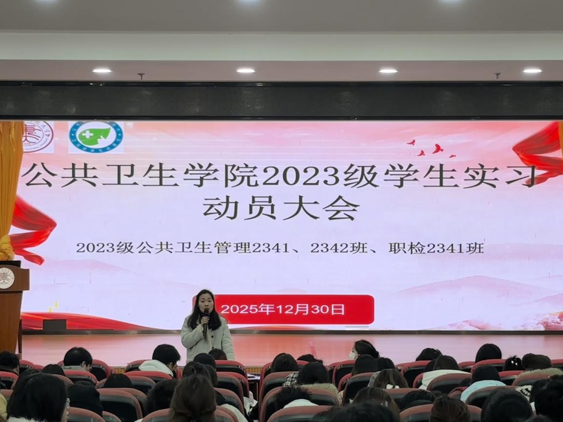 为引导2023级学生明确实习目标、树立安全意识、做好职业规划,2025年11月30日下午14:30,我院在学生报告厅隆重举行了2023级实习动员大会。学院党委副书记何睿、党委委员、副院长王晓晖、学生科全体教师、辅导员及2023级公共卫生管理、职业病危害检测评价技术等专业240余名学生共同参会。大会特邀贵州省疾病预防控制中心预科院陈老师、职业病防治科祝钰洋老师作专题动员。